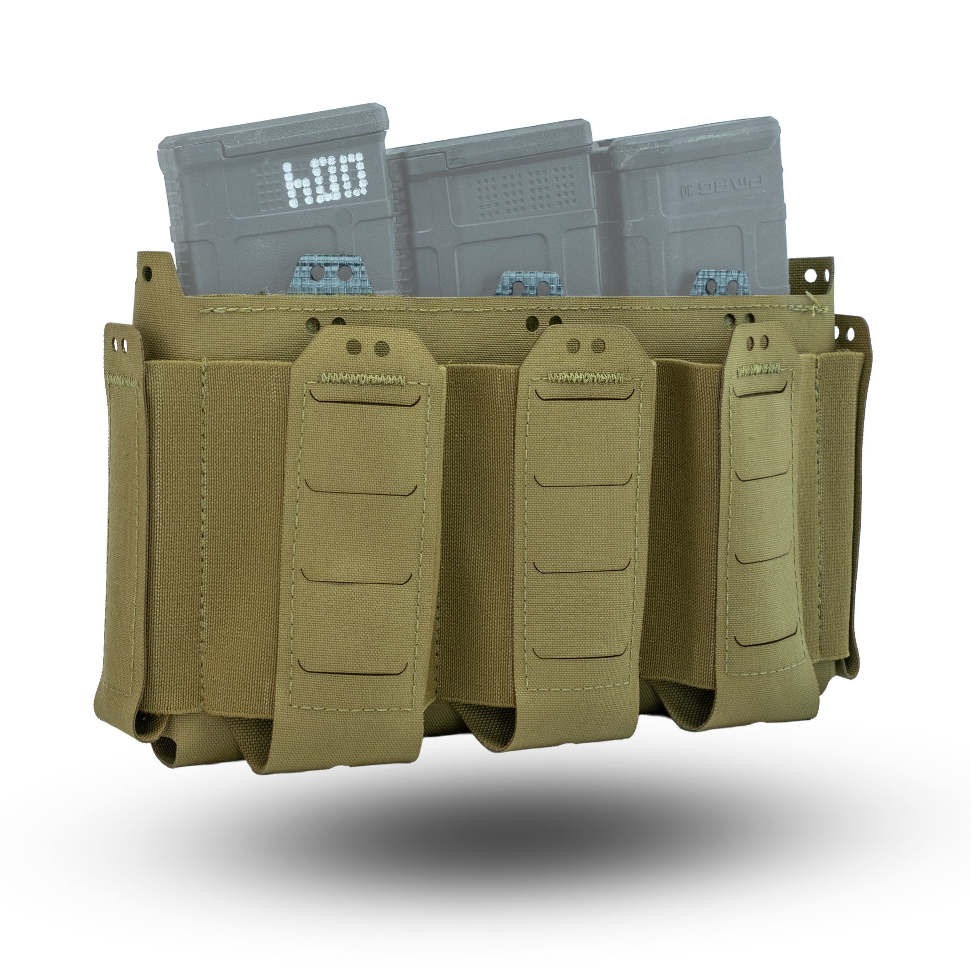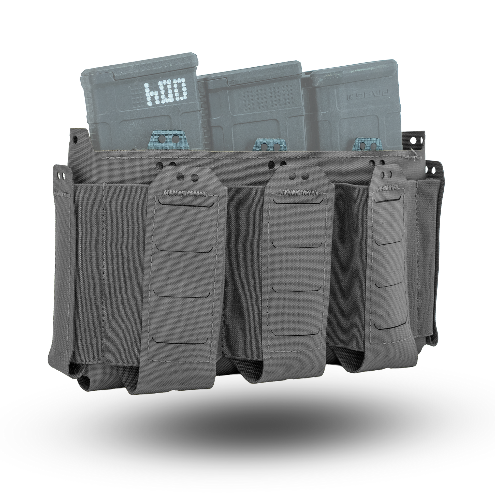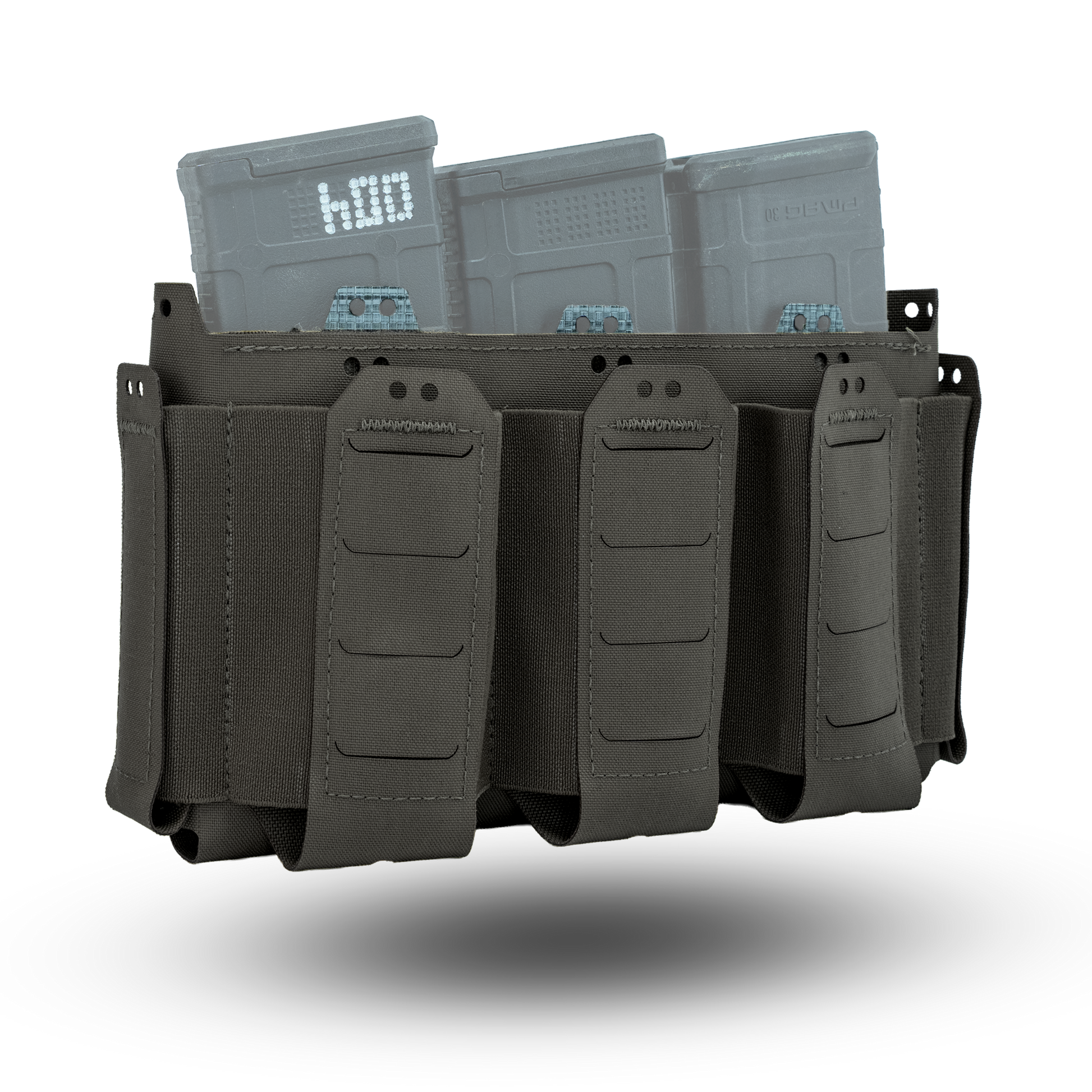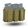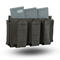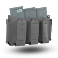 The D19 Placard is comprised of a main open "magazine" compartment which is lined with opposing Velcro and three elasticized pockets on the front of the placard. On the sides of the placard are two pouches which will hold small objects such as multitools & pistol magazines. All of the elasticized pockets have provisions for our Shock Cord Retainer Kit if it is required. Because this placard is derived from the D20 platform, all D20 inserts & accessories are compatible with the D19 platform. The three elasticized pockets on the front of the placard are sized to hold 5.56mm NATO magazines, CAT Gen 7 Tourniquets, or similarly sized objects.