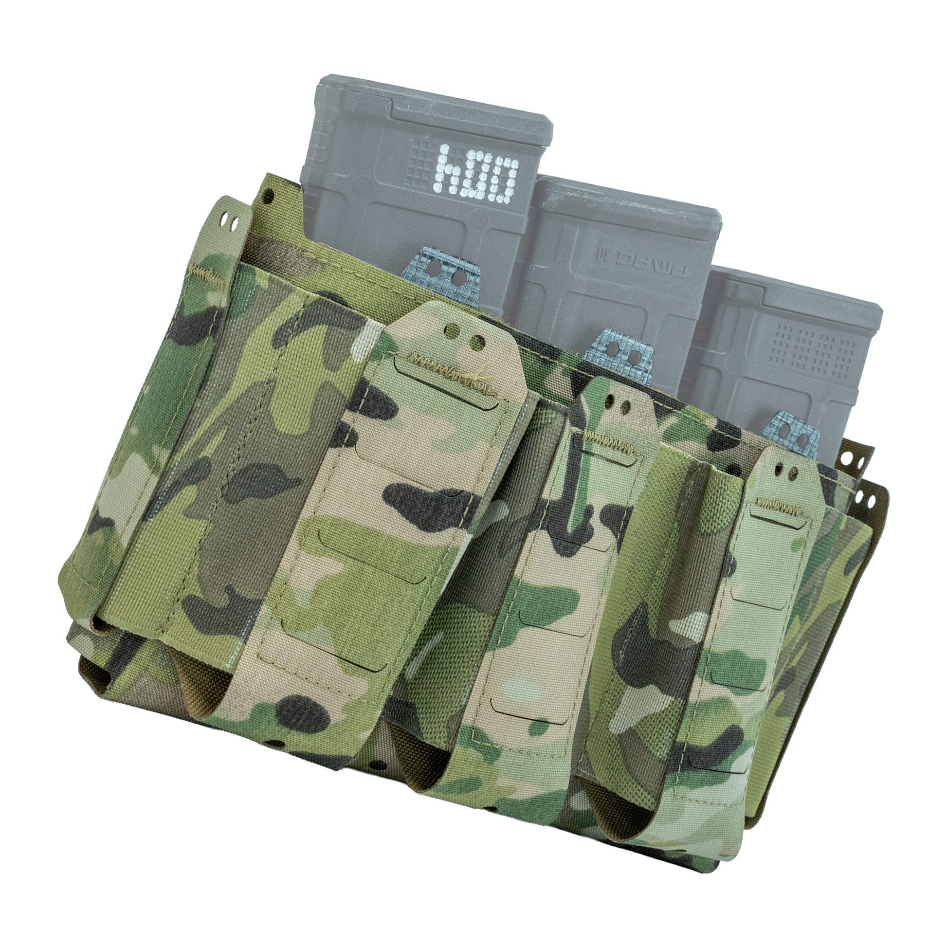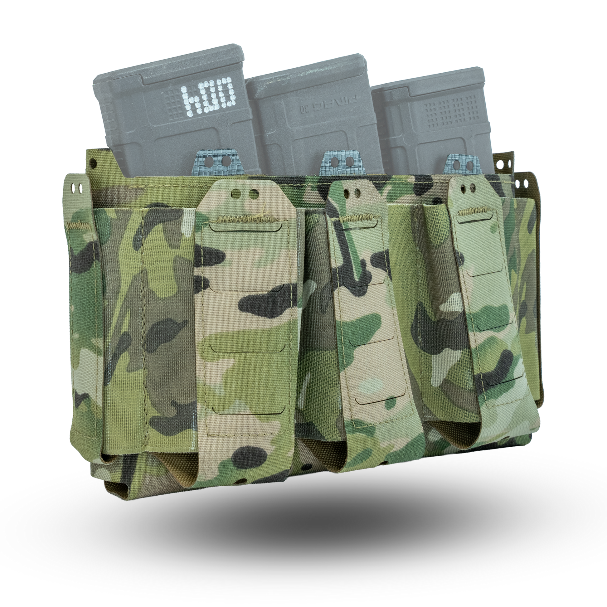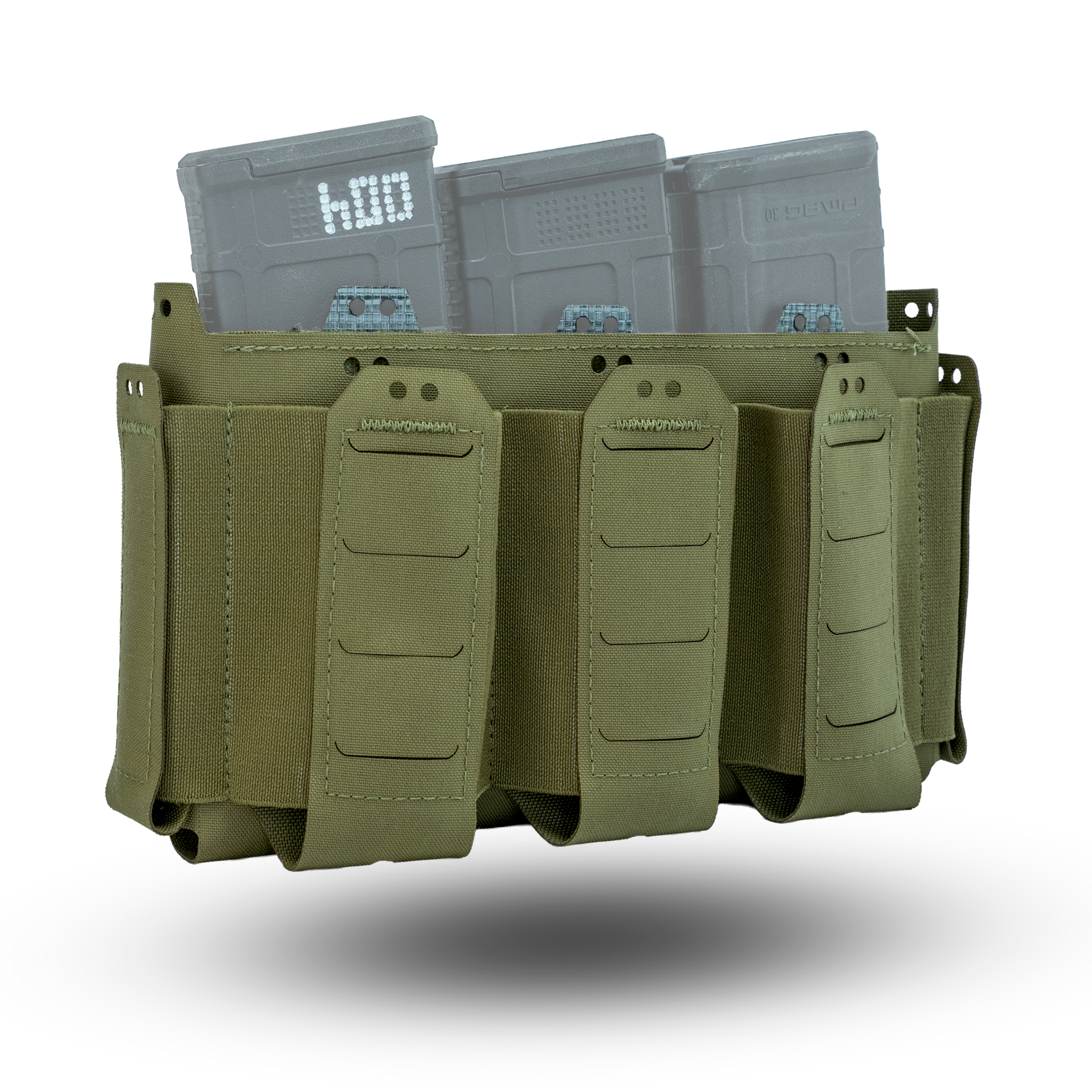 The D19 Placard is comprised of a main open "magazine" compartment which is lined with opposing Velcro and three elasticized pockets on the front of the placard. On the sides of the placard are two pouches which will hold small objects such as multitools & pistol magazines. All of the elasticized pockets have provisions for our Shock Cord Retainer Kit if it is required. Because this placard is derived from the D20 platform, all D20 inserts & accessories are compatible with the D19 platform. The three elasticized pockets on the front of the placard are sized to hold 5.56mm NATO magazines, CAT Gen 7 Tourniquets, or similarly sized objects.