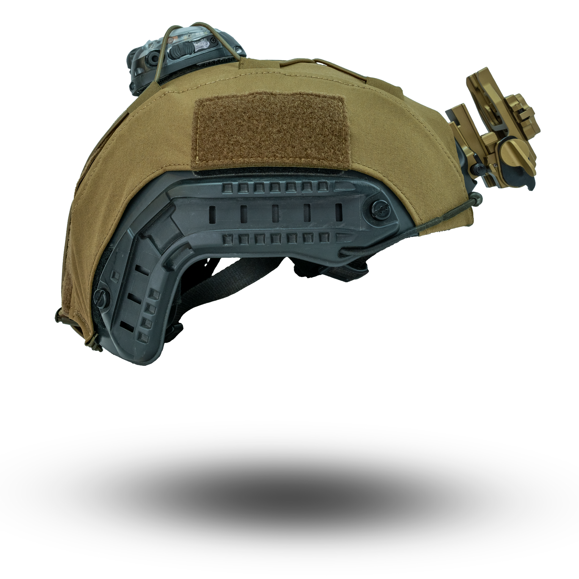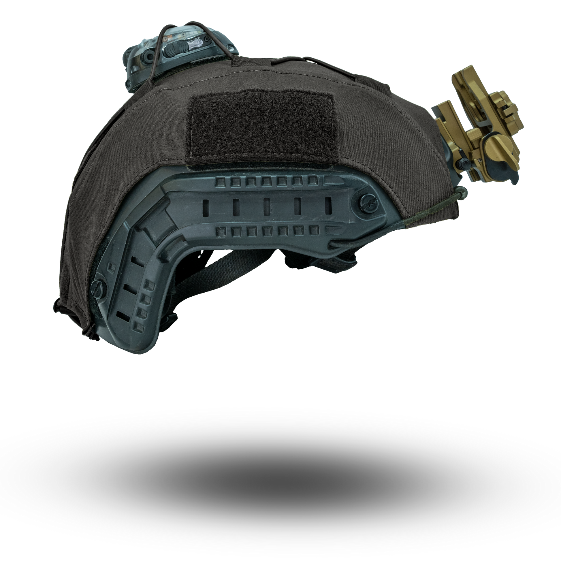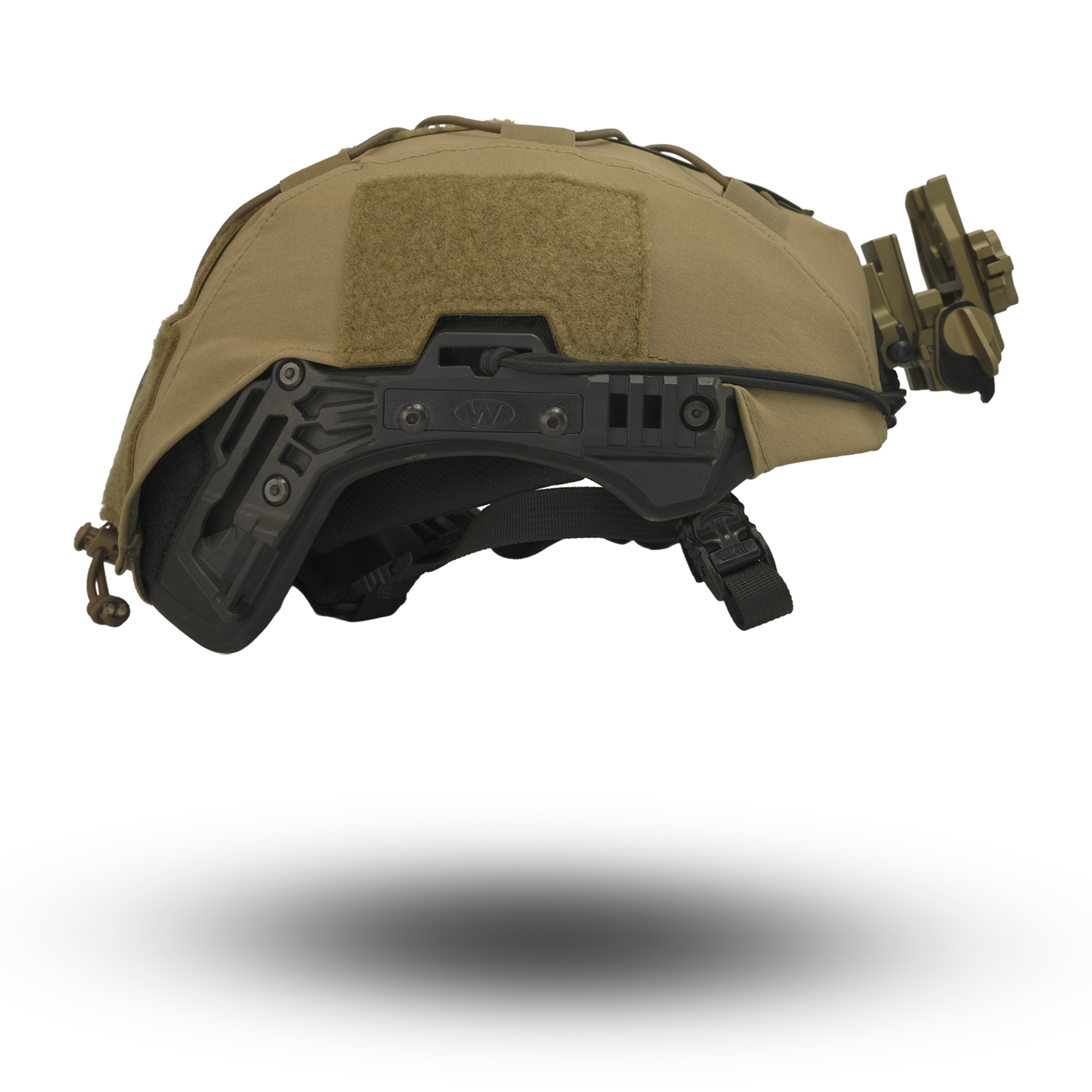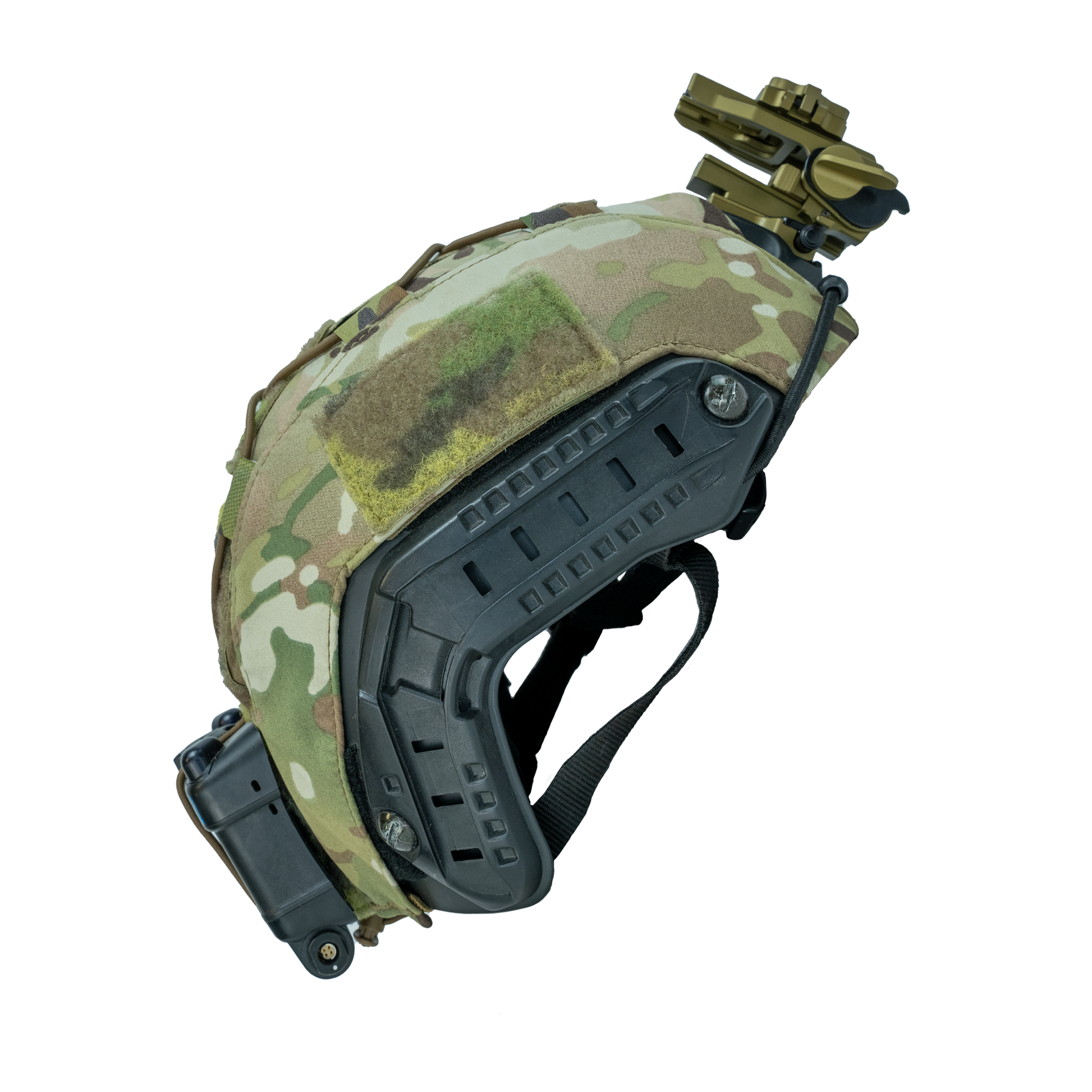 A utilitarian design that features provisions for cables, marking devices, and personal lighting systems. 4-way stretch fabric forms the side walls to provide a tight fit with all accessory configurations. A mesh channel bridges both sides, allowing airflow through the helmet’s molded vent holes.